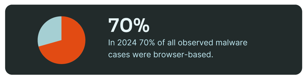 The browser is the single most important application in work today. While organizations increasingly shift toward browser-centric workflows, attackers have followed. In 2024, browser-based malware became the primary attack vector, accounting for 70% of all observed malware cases, while traditional email-based delivery plummeted to just 15%—a seismic shift in cybercriminal tactics.1